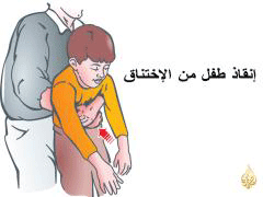 أما إذا كان الطفل يبلغ من العمر عاماً أو أكثر، فمن الأفضل أن يضعه الآباء حينئذ على بطنه في حجرهم، بحيث تتدلى رأسه وذراعاه، ثم يبدؤوا في الضرب على عظام كتفيه الخلفية براحة أيديهم بقوة لمرات متعددة، كي يُخرج الطفل الشيء الذي ابتلعه.