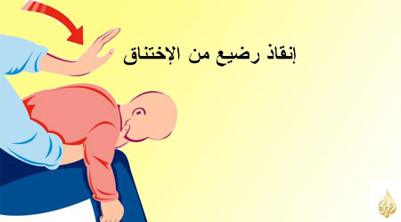 أما إذا كان الطفل يبلغ من العمر عاماً أو أكثر، فمن الأفضل أن يضعه الآباء حينئذ على بطنه في حجرهم، بحيث تتدلى رأسه وذراعاه، ثم يبدؤوا في الضرب على عظام كتفيه الخلفية براحة أيديهم بقوة لمرات متعددة، كي يُخرج الطفل الشيء الذي ابتلعه.